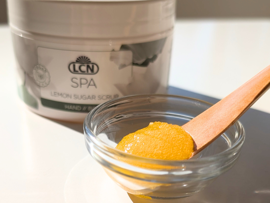 ハンドバスで手をあたためた後はスクラブを使ってやさしく角質ケアを行っていきます。